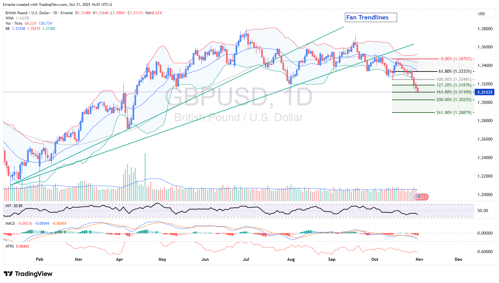 روند و مومنتوم: کابل حوالی ۱٫۳۱۱ و پایینتر از حمایت قبلی خط روند فن معامله میشود. MACD منفی و در حال گسترش؛ MFI ≈ ۳۱ حاکی از خروج پایدار نقدینگی.
