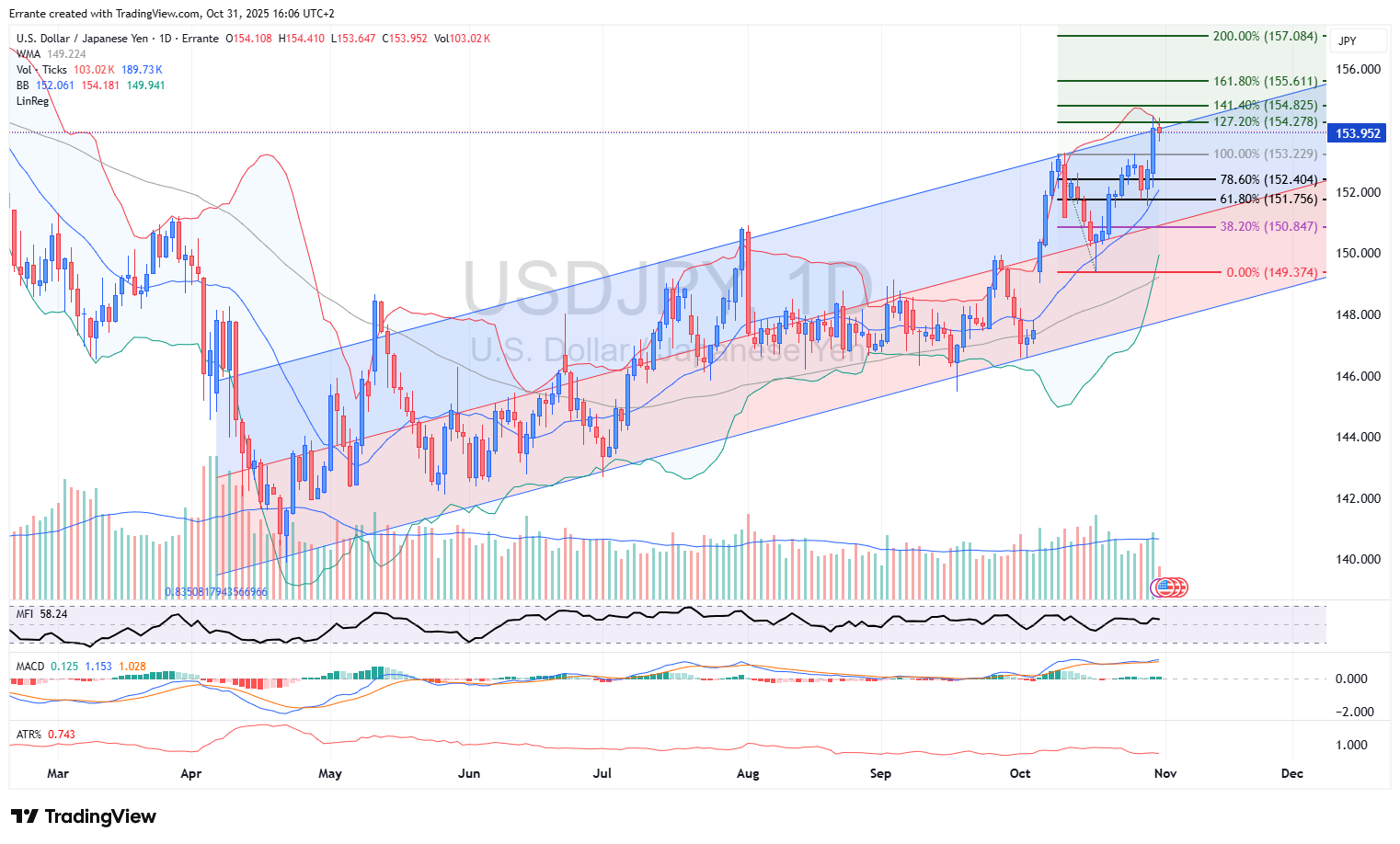 روند و مومنتوم: قیمت حوالی ۱۵۳٫۹۵ و چسبیده به لبه بالایی کانال و آخرین سقف نوسان (منطقه ۱۵۳٫۲۳–۱۵۳٫۲۹) با باند بالایی بولینجر ~۱۵۴٫۲–۱۵۴٫۳؛ MFI ≈ ۵۸ نشاندهنده تقاضای سالم (نه افراطی)؛ MACD نزدیک صفر تختشده و از خستگی مومنتوم پس از جهش اکتبر حکایت دارد.