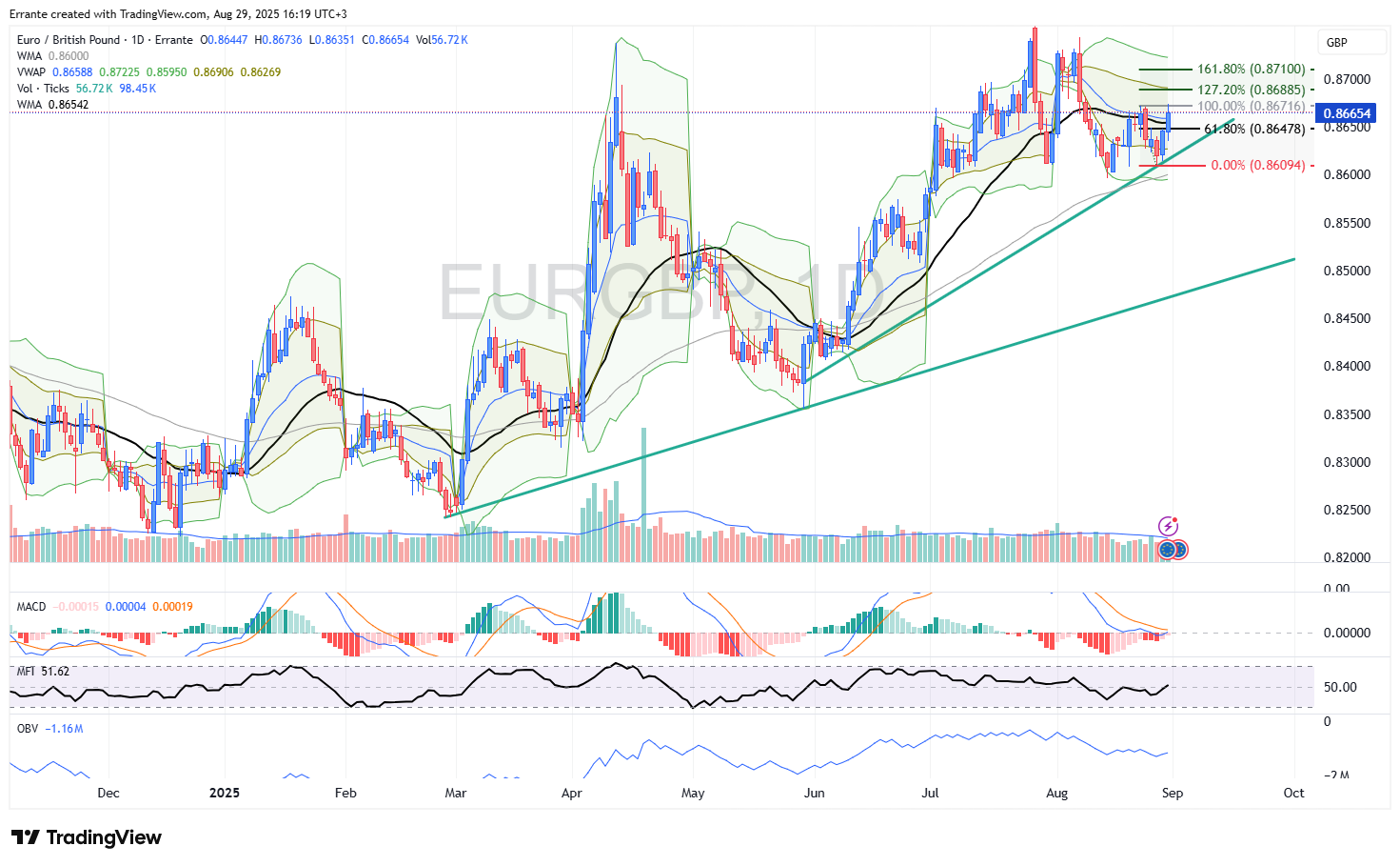 جفتارز EUR/GBP از سطح ۰.۸۶۱۰ (۶۱.۸٪ فیبوناچی)، در حوالی خط روند پر شیب تر صعودی اش جهش کرده و اکنون نزدیک ۰.۸۶۶۵ معامله میشود. RSI حدود ۵۲ و تثبیت OBV نشاندهنده بهبود مومنتوم است. مکدی نیز در حال مثبت شدن است که نشاندهنده ادامه حرکت صعودی است.