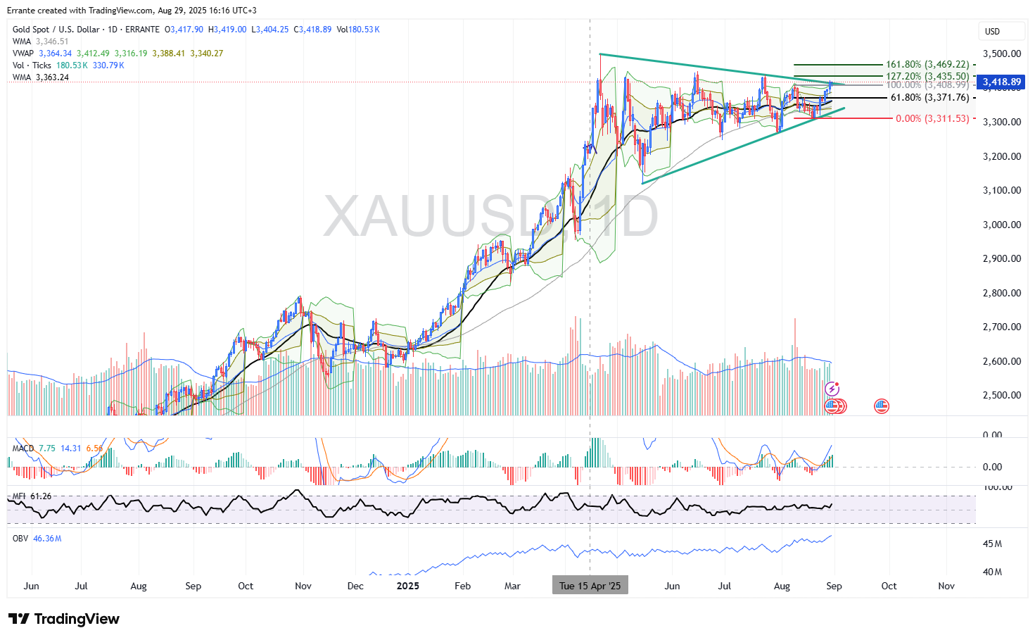 طلا پس از تلاشی برای شکست از الگوی مثلث چندماهه اش در محدوده ۳,۴۱۸ دلار در حال تثبیت است. RSI در حدود ۶۱ قرار دارد که حمایتی است، در حالی که افزایش OBV و حجم بالا نشاندهنده انباشت پیش از انتشار دادههای کلان هفته پیش رو می باشد.