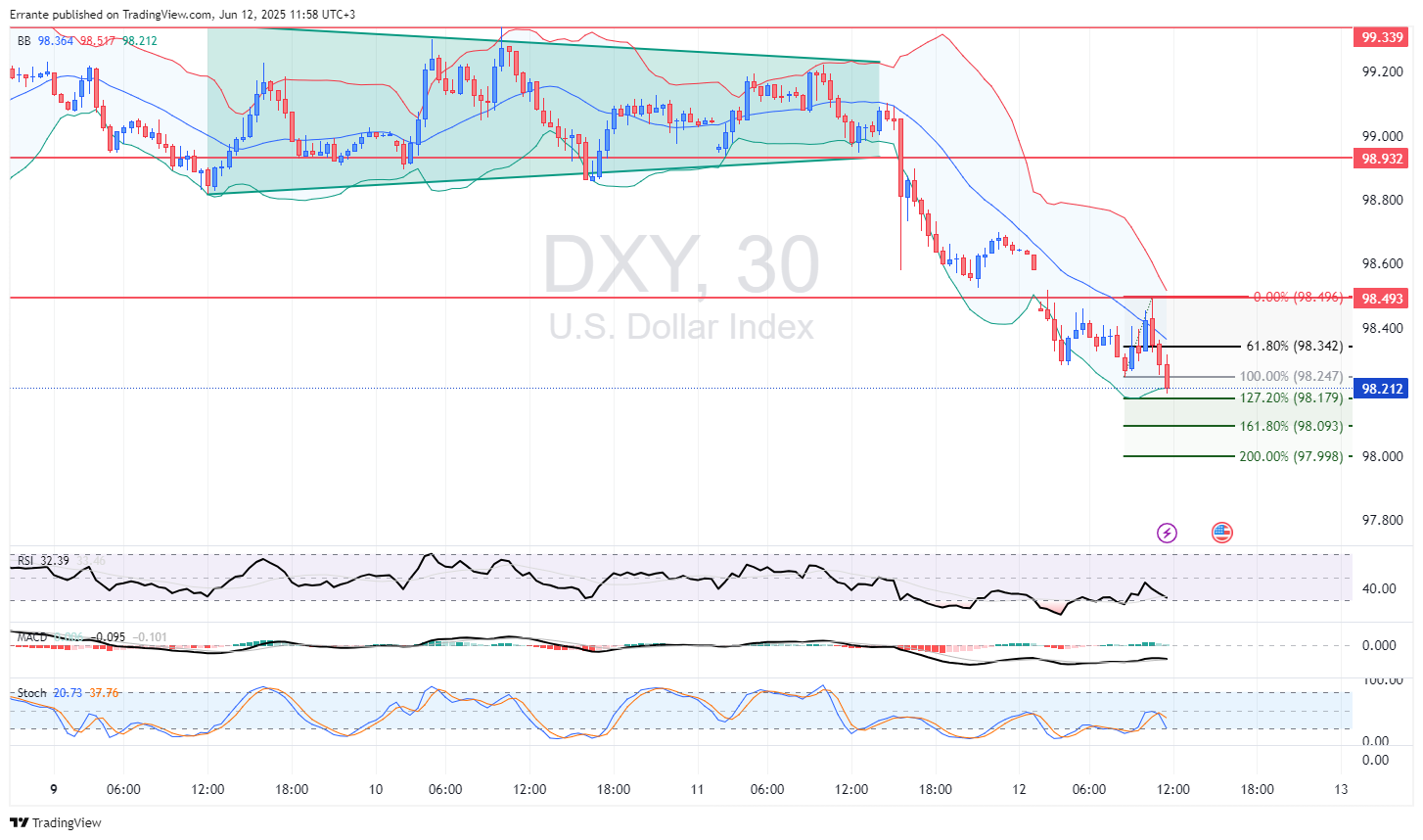 - حمایتها: ۹۸.۱۸ / ۹۸.۰۹ / ۹۷.۹۹ (فیبوناچی ۱۲۷، ۱۶۱، ۲۰۰٪)