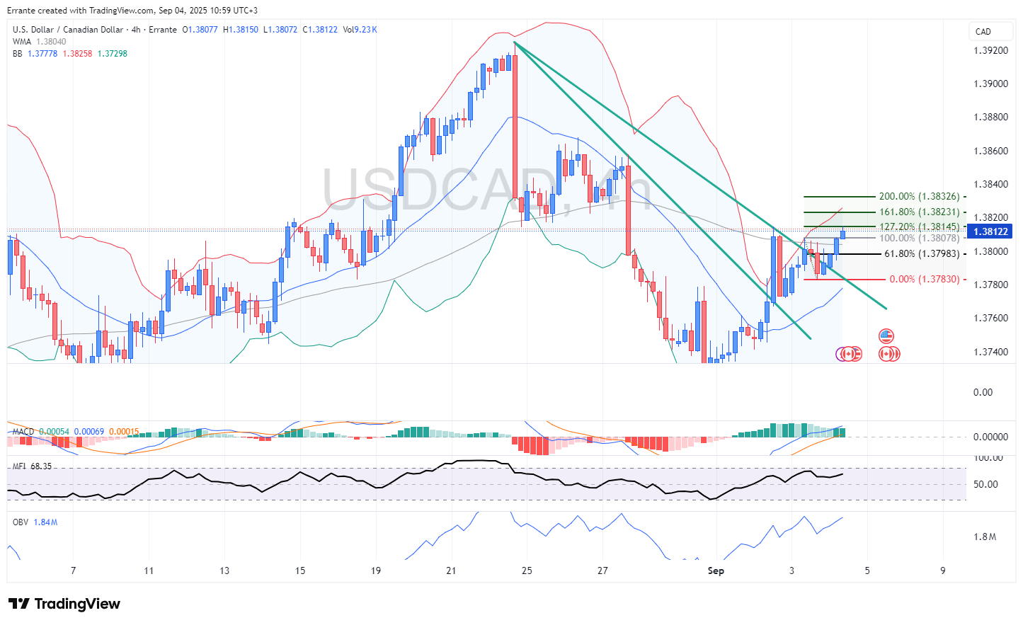 در نمودار چهارساعته، USD/CAD پس از برخورد با حمایت 1.3780 دوباره به سمت مقاومت 1.3810 بازگشته است. حرکت قیمت به بالای خط روند نزولی کوتاهمدت، نشانهای از تغییر مومنتوم به سمت بالا است. تثبیت بالای محدوده 1.3810–1.3820 شکست صعودی را تأیید میکند و اهداف بعدی 1.3832 (اکستنشن 200 درصد فیبوناچی) و در صورت تداوم حرکت، 1.3860 خواهند بود.