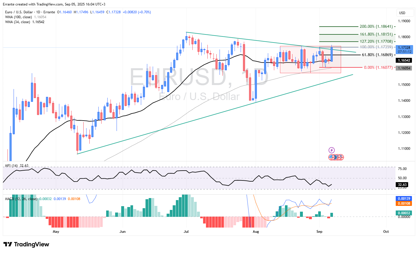 بستهشدن روزانه بالای ۱.۱۷۳۵–۱.۱۷۴۰ (لبه مثلث) مسیر را به ۱.۱۷۷۰ (۱۲۷.۲٪)، سپس ۱.۱۸۱۵ (۱۶۱.۸٪) و ۱.۱۸۶۴ (۲۰۰٪) میگشاید.