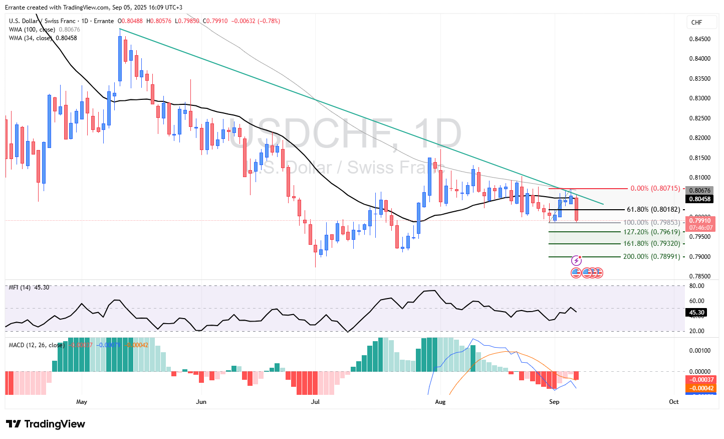 جفتارز به خط روند نزولی از ماه می واکنش نشان داده؛ قیمت زیر WMA34/100 (حدود ۰.۸۰۵/۰.۸۰۷) قرار دارد؛ مکدی دوباره منفی شده و MFI ≈ ۴۵- مومنتوم در حال افول است.