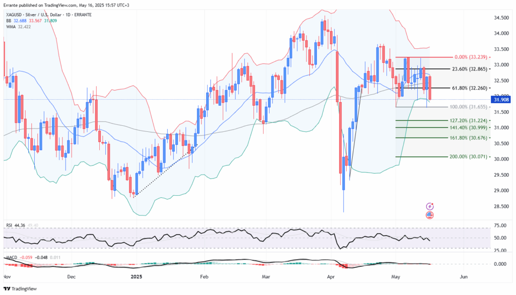 نقره در حال آزمودن سطح حمایتی ۳۱.۶۵ دلار (سطح فیبوناچی ۱۰۰٪) است، پس از چندین مرتبه مردود شدن از مقاومت ۳۳.۲۳ دلار. شاخص RSI در سطح ۴۴ و ضعف در MACD نشاندهنده احتمال اصلاح عمیقتر قیمت است. در صورت شکست حمایت ۳۱.۶۵ دلار، اهداف بعدی ۳۱.۲۲ و ۳۰.۶۷ دلار خواهند بود.